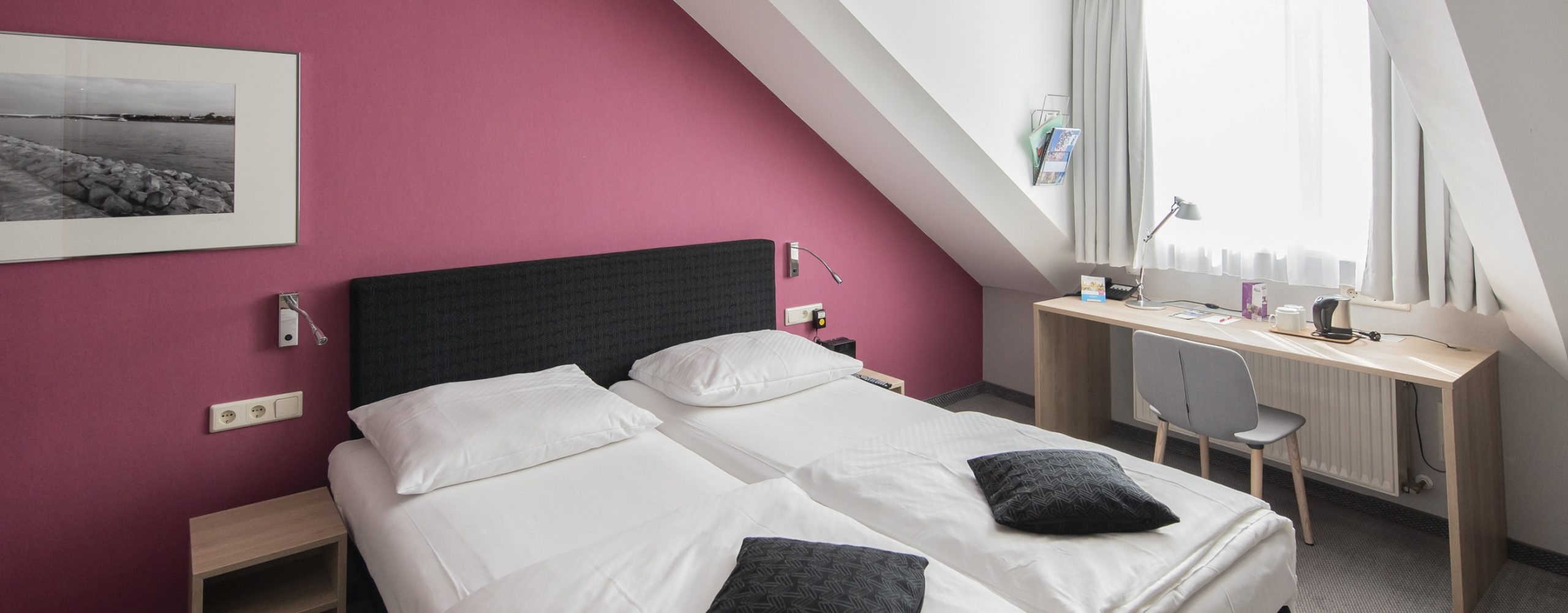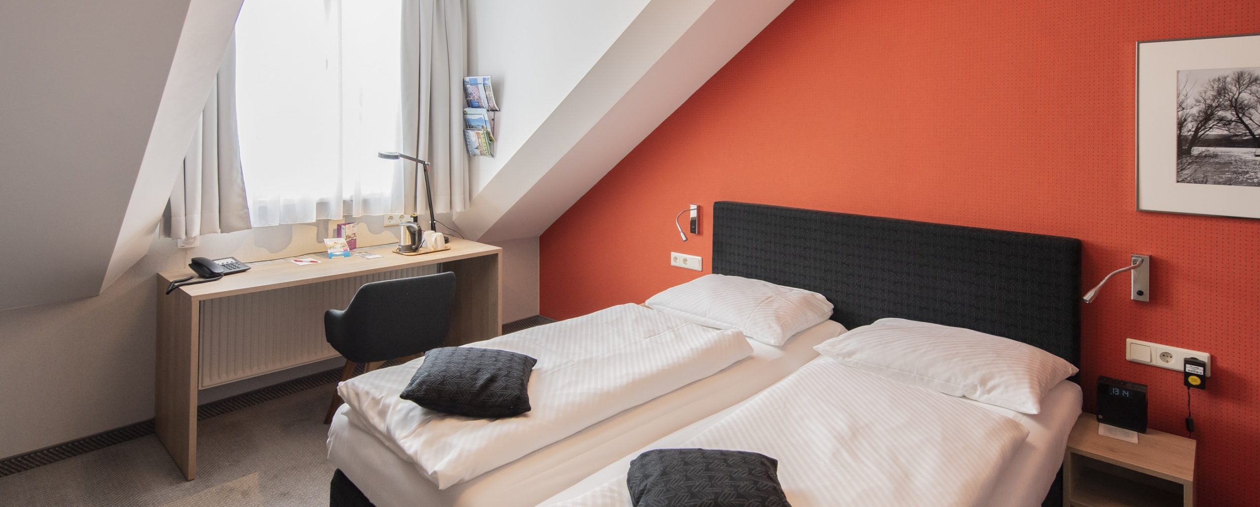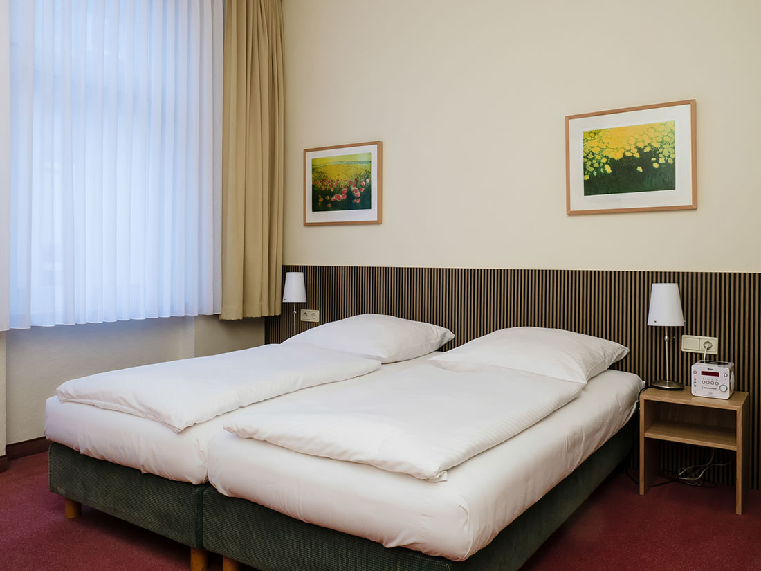 Unser Haus verfügt über insgesamt 42 Zimmer, die sich aufteilen in 12 Einzelzimmer, 20 Doppelzimmer, 4 Dreibettzimmer und 6 Appartements mit kompakter Küche. Egal ob Geschäftsreisender, Kongressbesucher oder Städtereisender: hier fühlen Sie sich wie zuhause! Alle Zimmer sind mit Dusche und WC sowie mit gratis WLAN, Kabel-TV und einem Bluetooth Radio zum Abspielen Ihrer Lieblingsmusik ausgestattet. Jedes Zimmer verfügt über einen kleinen Kühlschrank sowie einen Wasserkocher. Kaffee und Tee stehen zur Zubereitung kostenfrei bereit. Babybetten sind auf Anfrage für 10 € buchbar.